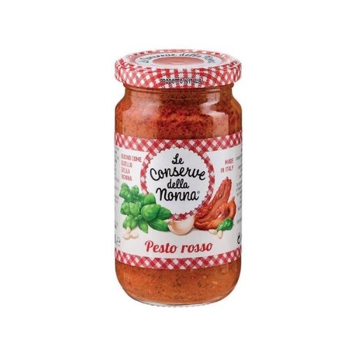 Pesto rojo con los sabores y aromas clásicos de tomates secos, albahaca y piñones. (190gr)